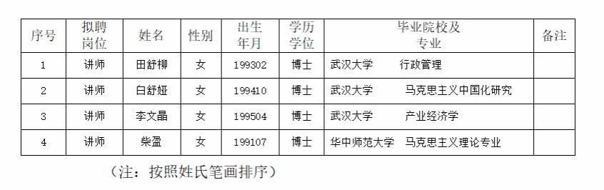 根據個人申請、思想政治審查、面試試講等流程,經學院學術委員會、黨政聯席會研究決定,拟聘用田舒柳等4名同志,現予以公示(具體名單如下),公示期7天,自2023年6月29日-2023年7月5日。