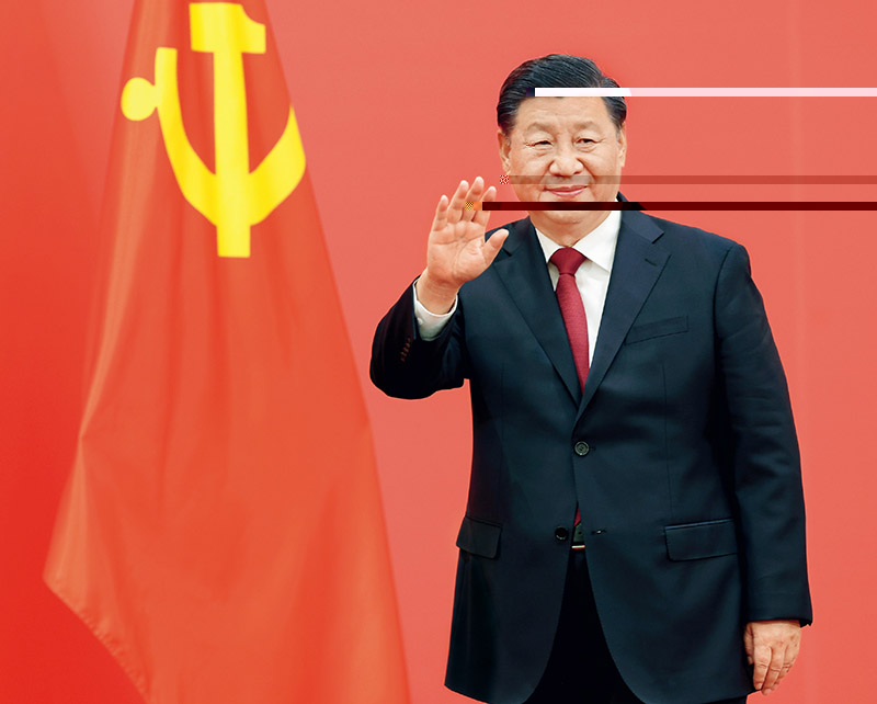 2022年10月23日,剛剛在中國共産黨第二十屆中央委員會第一次全體會議上當選的中共中央總書記習近平和中共中央政治局常委李強、趙樂際、王滬甯、蔡奇、丁薛祥、李希在北京人民大會堂同采訪中共二十大的中外記者親切見面。這是習近平向在場的中外記者揮手緻意。 新華社記者 龐興雷/攝