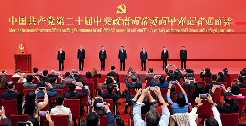 2022年10月23日,剛剛在中國共産黨第二十屆中央委員會第一次全體會議上當選的中共中央總書記習近平和中共中央政治局常委李強、趙樂際、王滬甯、蔡奇、丁薛祥、李希在北京人民大會堂同采訪中共二十大的中外記者親切見面。 新華社記者 申宏/攝