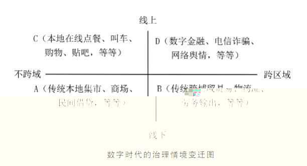 線上治理情境的出現,是數字社會發展給政府治理帶來的重要變化。在前數字時代,A和B治理情境普遍存在,也是政府治理習以為常的兩種情境。其中,A治理情境是農業社會政府面對的典型治理情境,B治理情境則是市場化、工業化、城市化、全球化帶來的顯著變化。進入數字時代,C和D兩種治理情境在不同領域普遍出現,是數字社會有别于農業社會和工業社會的關鍵變化。相比A、B而言,C、D是政府面對的前所未有的治理情境。從A、B演變到C、D,社會行動者之間的互動越來越少地受到實體空間的束縛。在A的基礎上,B和C分别實現了空間邊界的突破和空間維度的擴展,D則同時具備這兩個方面特征。D治理情境是數字時代的基礎性變動和标識性變化。在這種情境中,分布在全國乃至全球的行動者之間的相互影響不需要通過實體空間就能發生,信息、資金等通過數字空間就可以實現跨區域流動。數字金融、電信詐騙、網絡輿情等都是這種治理情境的典型體現,也是近年來政府治理困境日漸凸顯的重點領域。