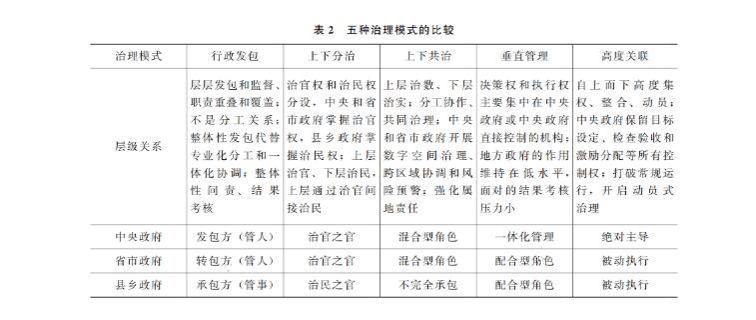 值得指出的是,在當代中國國家治理體系的整體結構中,“上下共治”與“行政發包”“上下分治”“垂直管理”“高度關聯”之間并不是競争和替代關系。第一,五種治理模式之間存在互補和并列的關系。它們是多層級政府面對不同環境壓力、應對不同治理問題、采取不同應對策略而生成的不同治理模式,共存于數字時代中國政府治理的實際運行中,隻不過分布于不同的治理領域、治理情境或治理階段,發揮着各自不同的治理效能,在中國國家治理體系中扮演不同角色而已。第二,五種治理模式并非基于單一的維度劃分,而是可以從不同維度進行分類和比較。例如,相比“高度關聯”而言,其他四種治理模式是更加常規型的治理模式;從地方分權程度看,“行政發包”“上下分治”更高,“垂直管理”“高度關聯”更低,“上下共治”居中;從中央政府或省市政府的過程控制程度看,“行政發包”“上下分治”最低,“上下共治”較高,“垂直管理”“高度關聯”更高。第三,五種治理模式并不互斥。例如,“行政發包”中内含“上下分治”,“上下共治”中包含“上層治官”和“不完全發包”,“垂直管理”“高度關聯”中也可以存在“上層治數、下層治實”。
