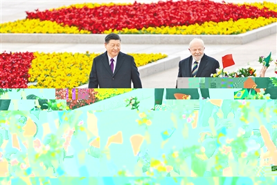 四月十四日下午,國家主席習近平在北京人民大會堂同來華進行國事訪問的巴西總統盧拉舉行會談。這是會談前,習近平在人民大會堂東門外廣場為盧拉舉行歡迎儀式。 新華社記者 丁海濤攝 |