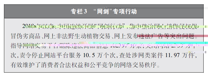 規範網絡交易活動。讓網絡交易活動在規範中運行,是營造良好網絡市場環境、維護廣大網絡交易主體權益的必然要求。開展“網劍行動”,集中治理網上銷售侵權假冒僞劣商品違法行為,重拳打擊網上非法交易野生動植物及其制品活動。嚴格落實網絡平台責任,強化互聯網廣告監管。針對“直播帶貨”、微店營銷等新型網絡交易形式,嚴管網絡招徕渠道,查處多家涉嫌違法網站和平台用戶。針對網絡傳銷行為開展專項行動,對網絡購物型傳銷、網絡投資理财型傳銷、網絡創業型傳銷,實施重點打擊查處。通過一系列執法,重點領域、重點主體、重點形式的網絡交易活動得到有效規範。