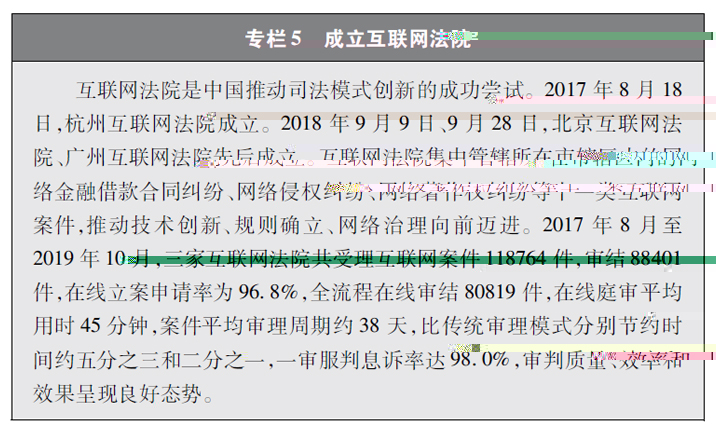 積極探索司法活動與網絡技術深度融合的新路徑、新領域、新模式,讓社會正義“提速”。積極推行大數據、雲計算、人工智能、區塊鍊等現代科技在訴訟服務、審判執行、司法管理等領域的深度應用,先行先試構建中國特色的網絡司法模式。鼓勵各地法院因地制宜,結合當地互聯網産業發展情況和網絡糾紛特點,探索具有地域特色的新型互聯網審判機制。相繼設立杭州、北京、廣州互聯網法院,探索實行“網上案件網上審理”。大力推進數字檢察工作,堅持大數據賦能法律監督,系統整合各類辦案數據,積極探索構建大數據法律監督模型和平台,努力推動個案辦理式監督和類案治理式監督相結合,為新時代法律監督提質增效。網絡司法的新模式标志着中國特色社會主義司法制度在網絡領域進一步發展完善,逐漸成為中國司法的一張亮麗名片。