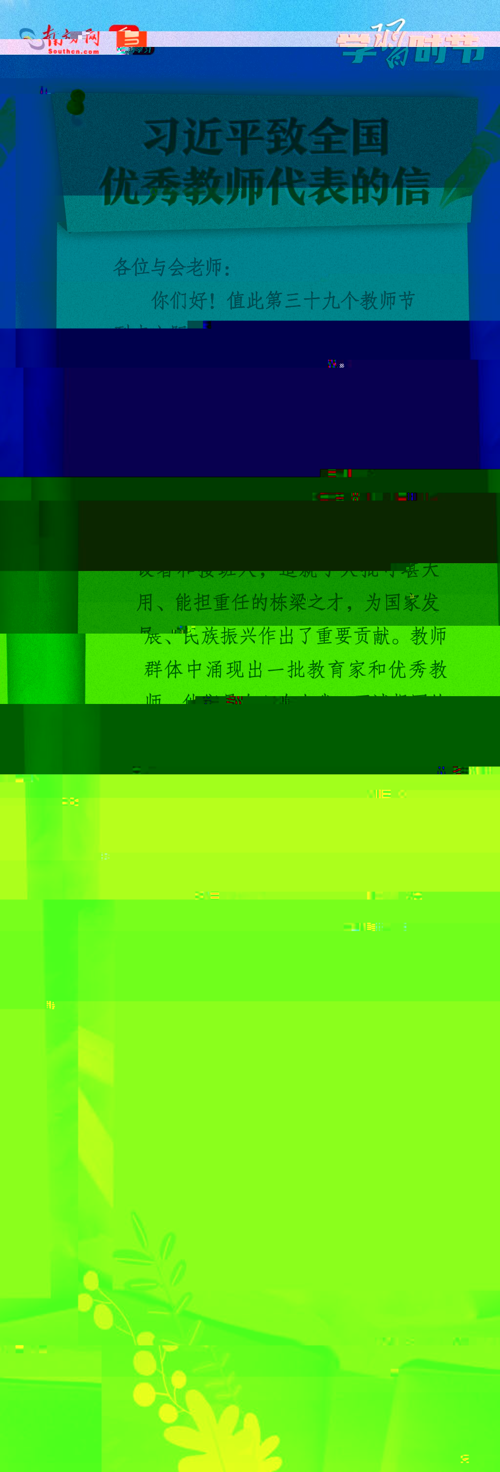 9月9日,全國優秀教師代表座談會在京召開。中共中央總書記、國家主席、中央軍委主席習近平緻信與會教師代表,在第三十九個教師節到來之際,代表黨中央,向他們和全國廣大教師及教育工作者緻以節日的問候和誠摯的祝福。