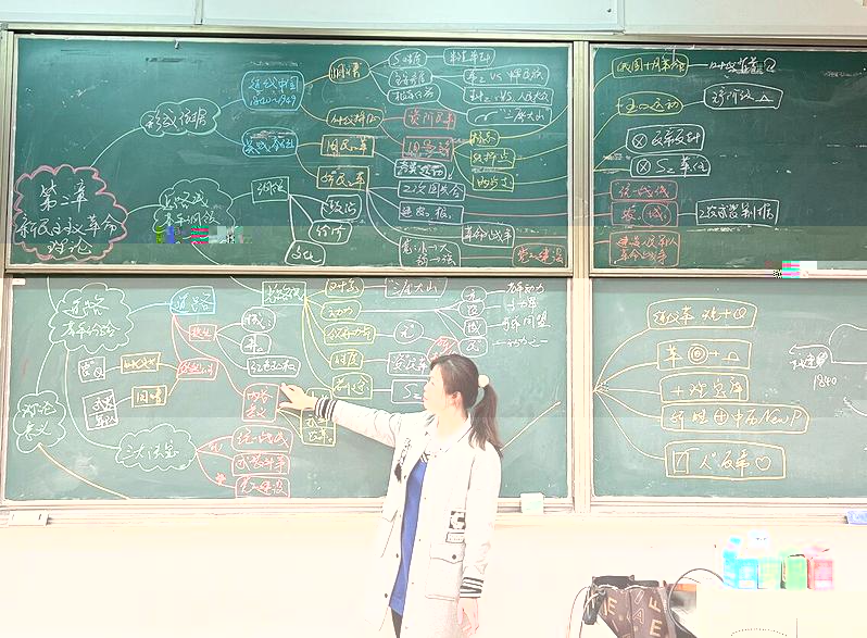 孫蕊芳認為現代的PPT教學進程較快,尤其是理論教學在講述中不容易讓學生印象深刻,将理論結構和重要内容以思維導圖的形式展現在黑闆上,在講解相應章節時可以讓學生對照思路理解内容,将傳統闆書教學與現代化教學方式結合使用,可以很好地幫助學生提高學習效率,保證課堂擡頭率。“我希望學生在學習這門理論課時,能夠利用好課堂時間,迅速掌握理論架構與理解思路,清晰把握重要事件與史實。”孫蕊芳說。