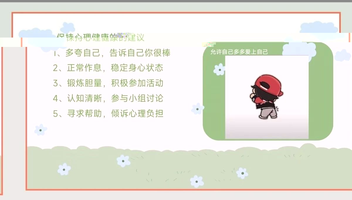 心理委員任夢雅從大學生的角度出發,分别強調了在學習、生活、工作三個方面上心理健康的重要性。接着,任夢雅介紹了在這三個方面上的常見心理問題,如學習壓力太大、人際關系導緻負面情緒積壓的問題。最後,任夢雅根據具體事例總結情緒問題的解決方案:“情緒低落時,深呼吸,并且使用适當的方式排解負面的情感。”同時,任同學也建議大家,如果有任何心理上的不适或者不開心的事,可以向她傾訴,或者積極與親人、朋友溝通,及時纾解情緒,保持一個健康、快樂的狀态。
